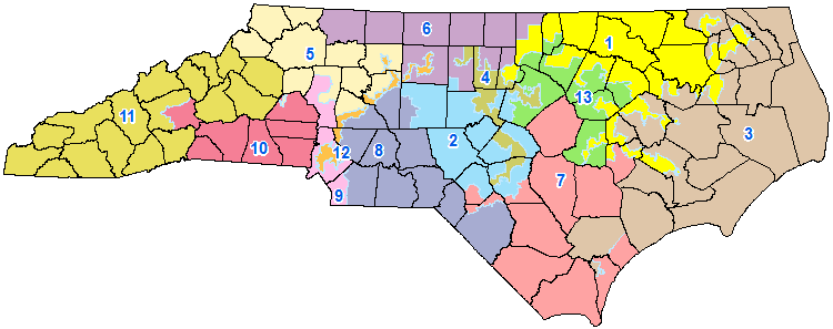District 12 is a narrow stretch of land sandwiched between districts 8 and 9. Black voters comprise over 50% of voters in both districts, around 50.7% of residents in District 12 and 52.7% of District 1. North Carolina claimed that District 1 was intended to be a majority minority district in accordance with the Voting Rights Act–but the Justices determined that this did not meet the appropriate criteria for taking race into account and the district was drawn in “error.”