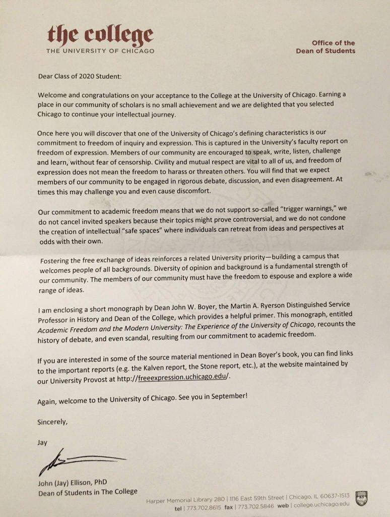 In a letter Dean of Students in the College John Ellison informed incoming first year students at the University of Chicago to expect an environment committed to freedom of inquiry and freedom of expression. He additionally warns students not to expect “intellectual safe spaces where individuals can retreat from ideas and perspectives at odds with their own.”